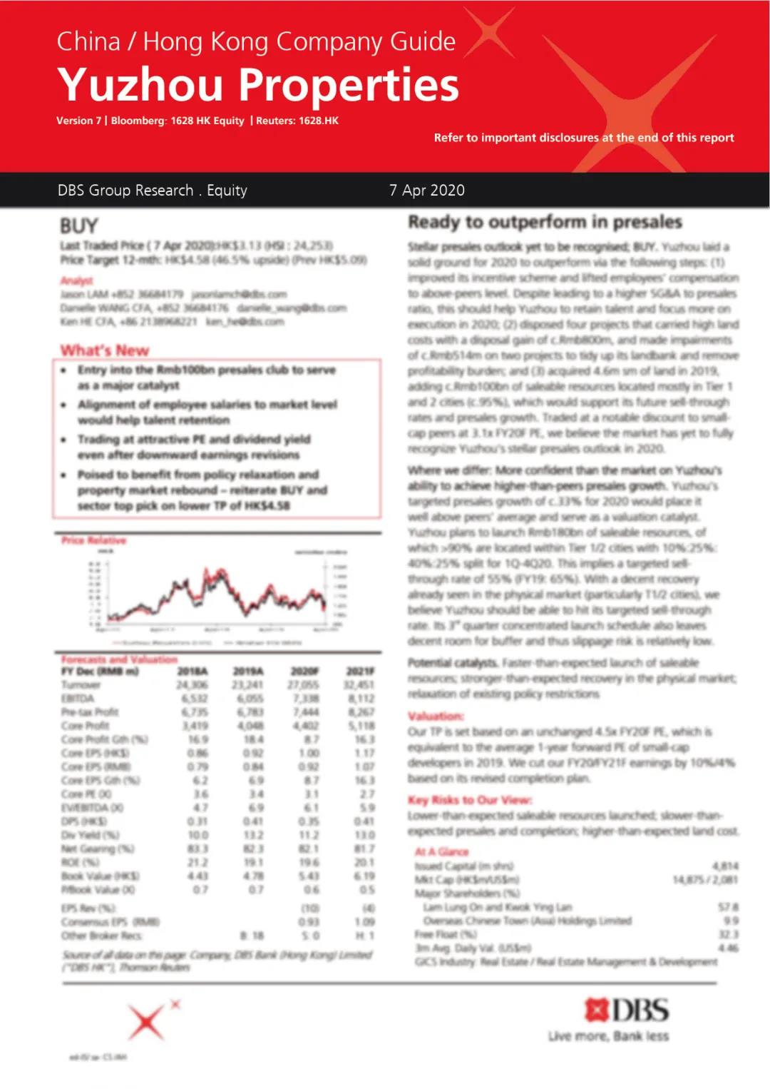 國際知名投行星展銀行發(fā)布報(bào)告指出,禹洲地產(chǎn)(01628.HK)出售4個(gè)高地價(jià)項(xiàng)目,告別低毛利項(xiàng)目;2019年新增土儲(chǔ)460萬平方米,新增貨值超人民幣1,000億元,土儲(chǔ)充足優(yōu)渥,為2020年千億銷售打下堅(jiān)實(shí)基礎(chǔ),目前估值極具吸引力,維持行業(yè)首選,重申“買入”評級,給予目標(biāo)價(jià)4.58港元。