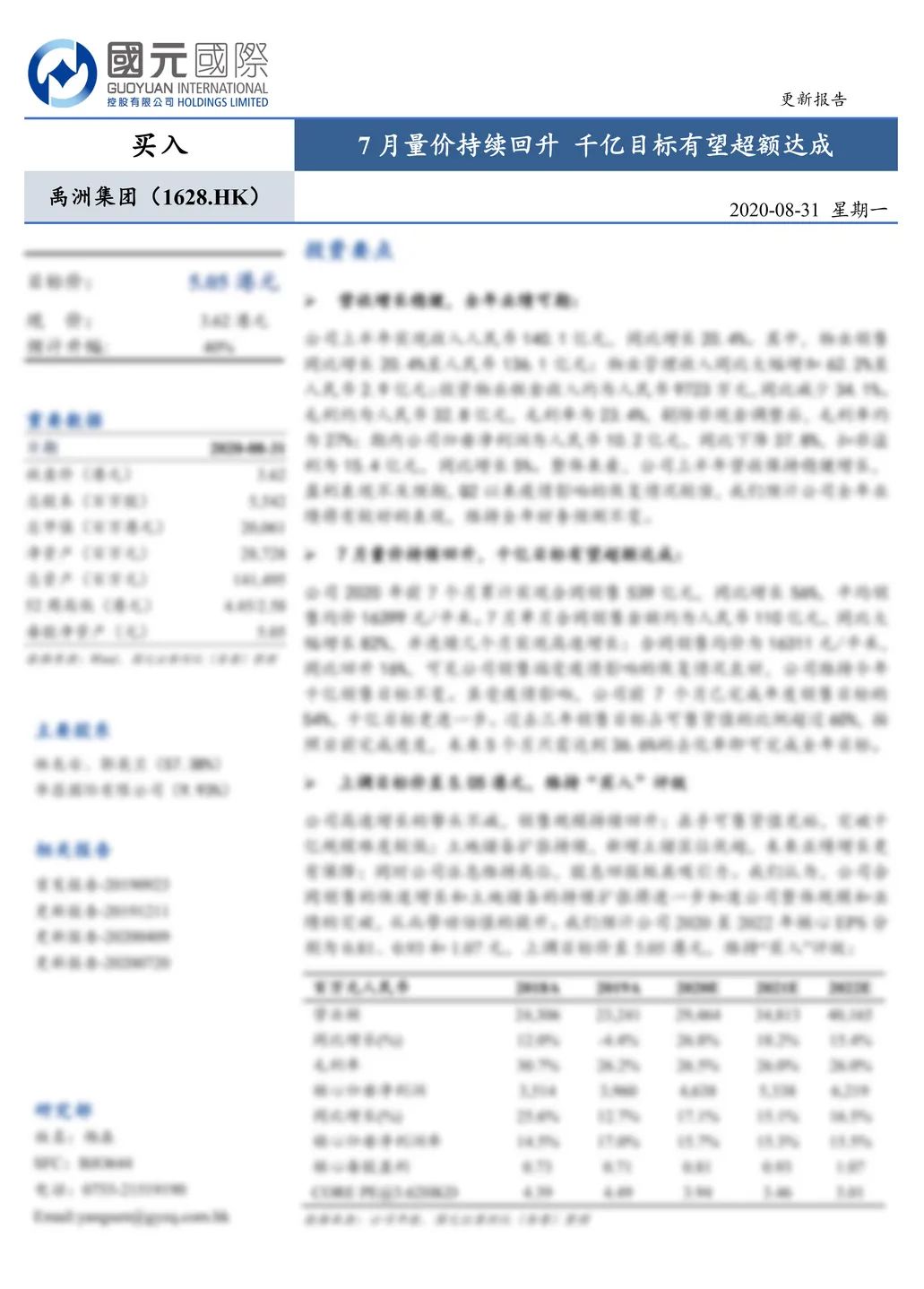 國元國際|禹洲集團(01628.HK):七月銷售持續(xù)回升,千億目標有望超額達成,上調(diào)目標價至5.05港元
