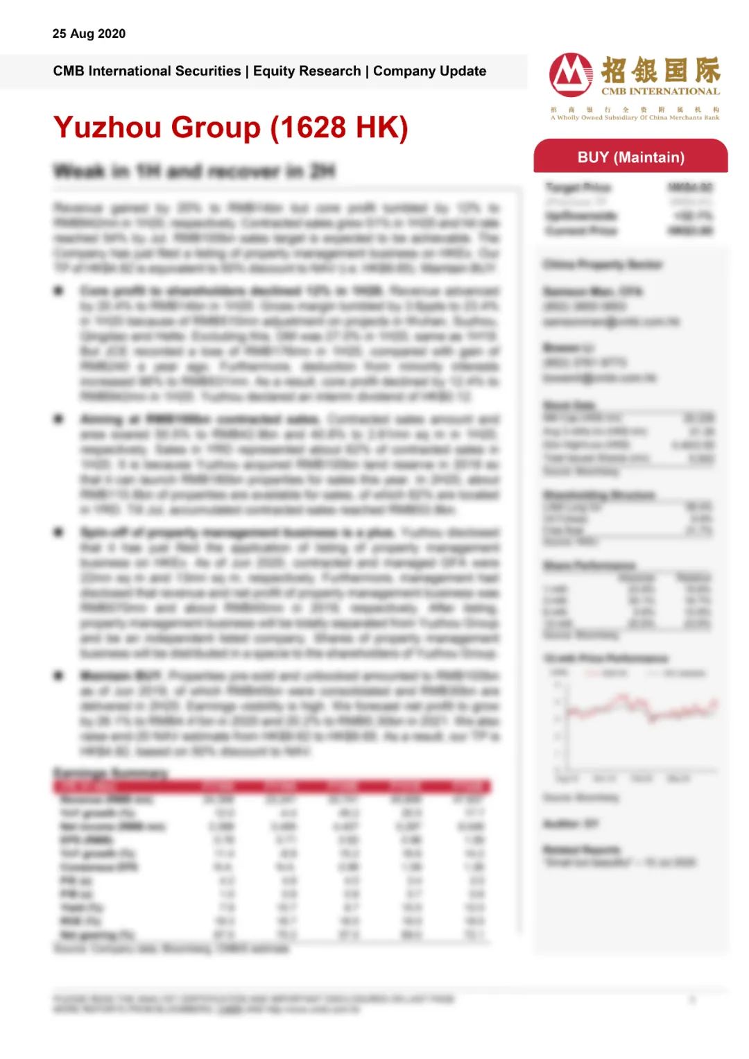 國際知名投行招銀國際近日發(fā)表研究報告指出,禹洲集團(01628.HK)今年上半年實現(xiàn)合約銷售金額為人民幣429億元,按年增幅達51%,至2020年8月,累計合約銷售金額達人民幣654億元,已完成全年千億目標的65%,千億目標必可達成;禹洲集團的盈利將繼續(xù)維持高水平,公司物管業(yè)務分拆上市的計劃將帶來利好,維持禹洲集團 “買入”評級,目標價4.82港元。