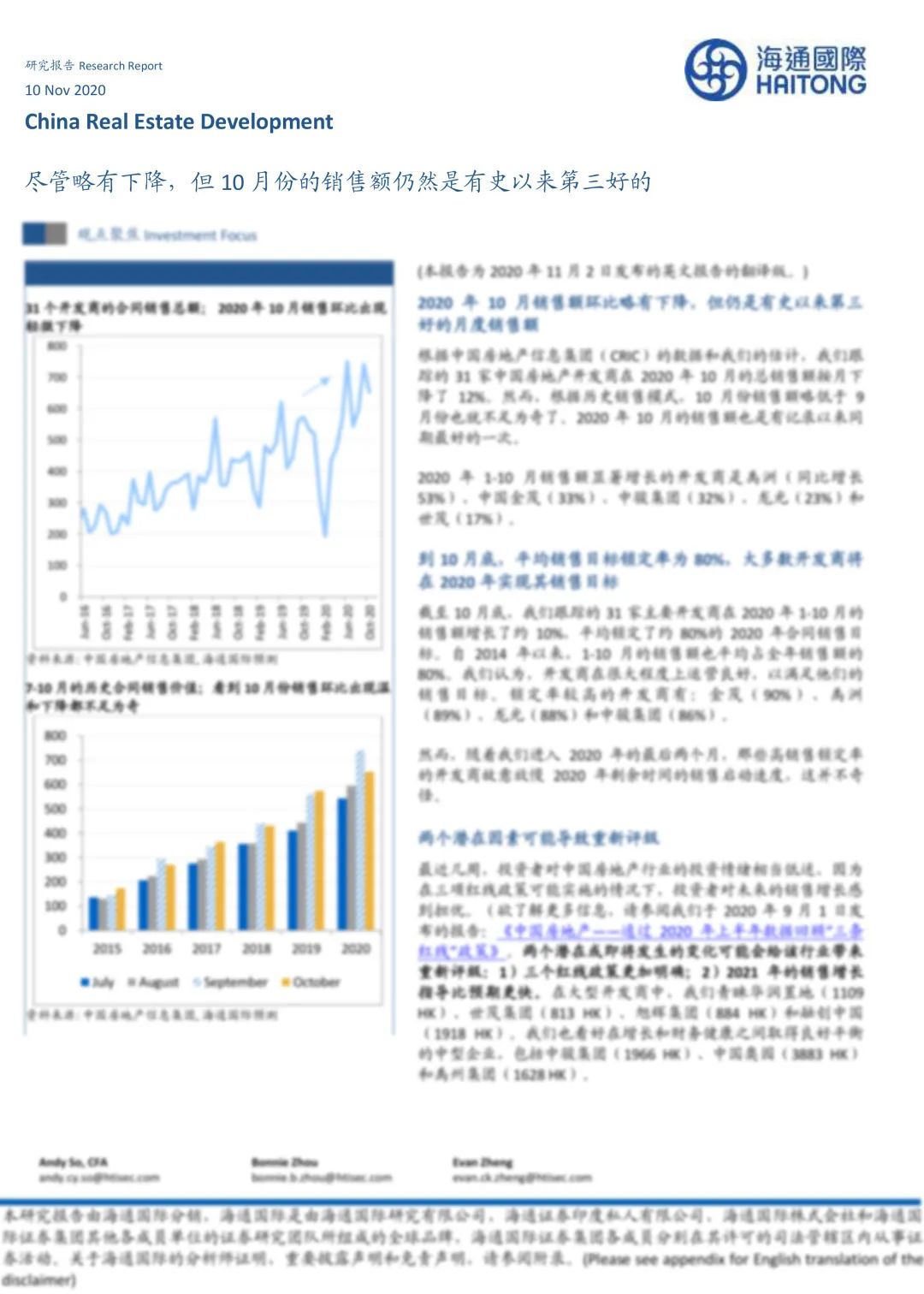 海通國際指出,截至10月底,該行跟蹤的31家主要開發(fā)商在2020年1-10月的銷售額增長了約10%,平均鎖定了約80%的2020年合同銷售目標(biāo)。自2014 年以來,1-10 月的銷售額也平均占全年銷售額的80%。