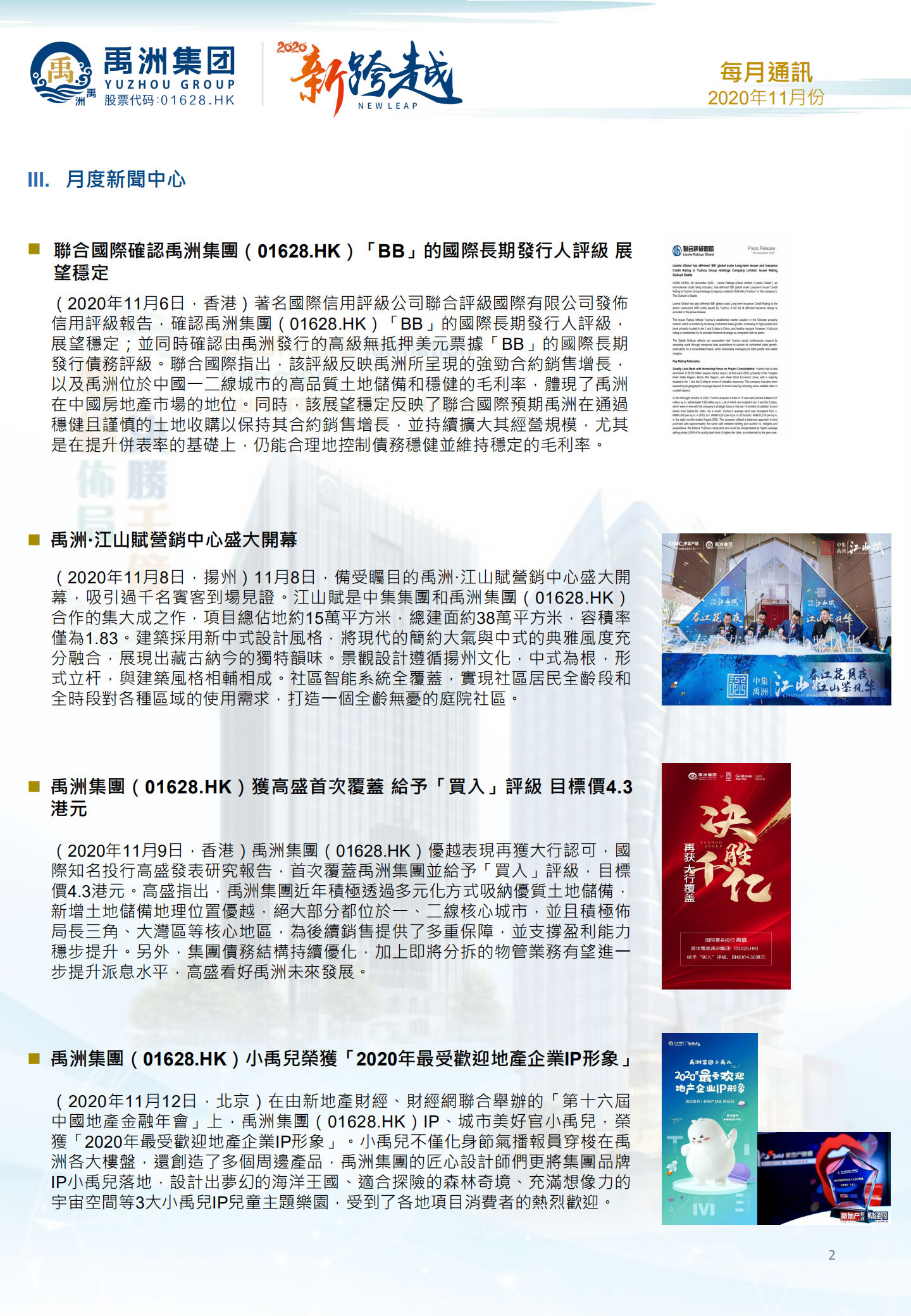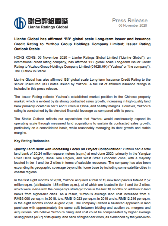 著名國際信用評級公司聯(lián)合評級國際有限公司也發(fā)布信用評級報告,確認禹洲集團“BB”的國際長期發(fā)行人評級,展望穩(wěn)定;并同時確認由禹洲發(fā)行的高級無抵押美元票據(jù)“BB”的國際長期發(fā)行債務評級。聯(lián)合國際指出,該評級反映了禹洲所呈現(xiàn)的強勁合約銷售增長,以及禹洲位于中國一二線城市的高質量土地儲備和穩(wěn)健的毛利率,體現(xiàn)了禹洲在中國房地產(chǎn)市場的地位。同時,該展望穩(wěn)定反映了聯(lián)合國際預期禹洲在通過穩(wěn)健且謹慎的土地收購以保持其合約銷售增長,并持續(xù)擴大其經(jīng)營規(guī)模,尤其是在提升并表率的基礎上,仍能合理地控制債務穩(wěn)健并維持穩(wěn)定的毛利率。
