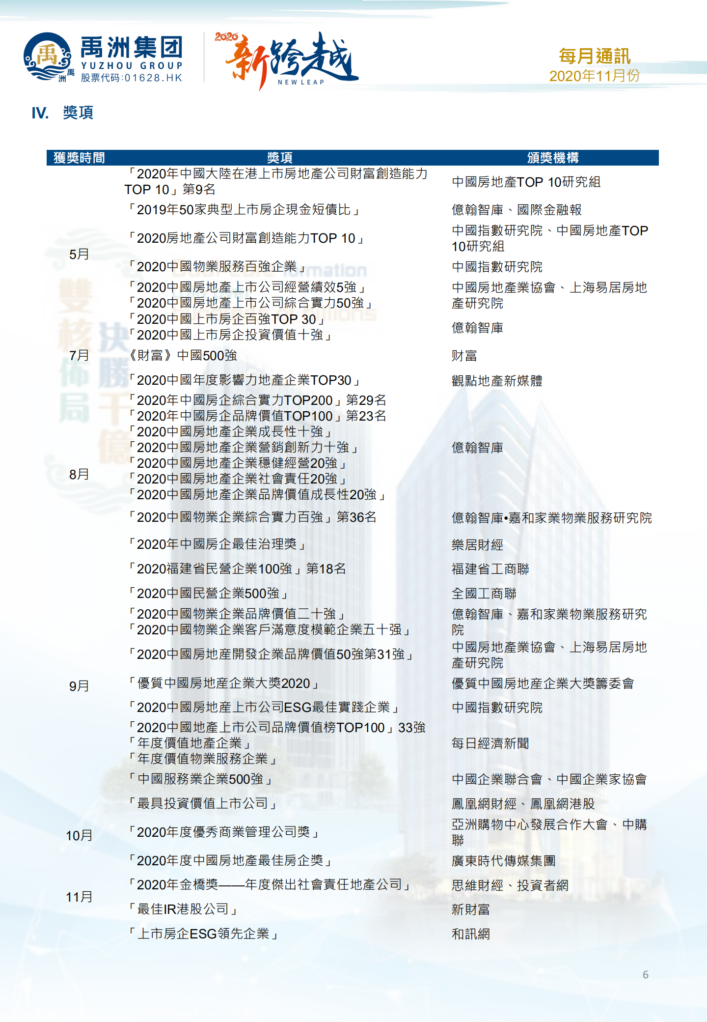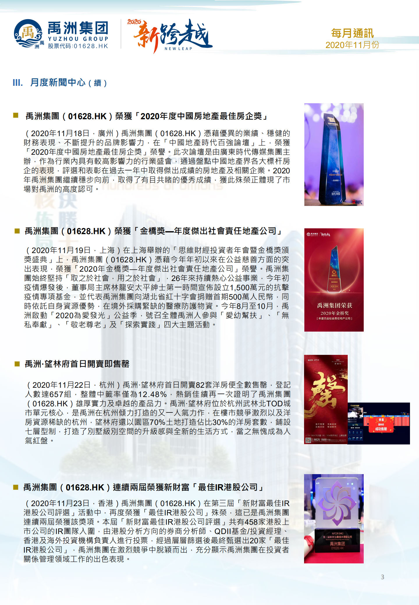 禹洲集團在可持續(xù)發(fā)展及擔當社會責任方面取得的成績受到市場廣泛肯定。11月26日,在《和訊網(wǎng)》主辦的“第十一屆地產(chǎn)金融創(chuàng)新峰會”上,禹洲集團一舉斬獲“上市房企ESG領先企業(yè)”榮譽。11月19日,在上海舉辦的“思維財經(jīng)投資者年會暨金橋獎頒獎盛典”上,禹洲集團又憑借今年年初以來在公益慈善方面的突出表現(xiàn),被授予“2020年金橋獎—年度杰出社會責任地產(chǎn)公司”。11月18日,在“中國地產(chǎn)時代百強論壇”上,禹洲集團眾望所歸,獲頒“2020年度中國房地產(chǎn)最佳房企獎”