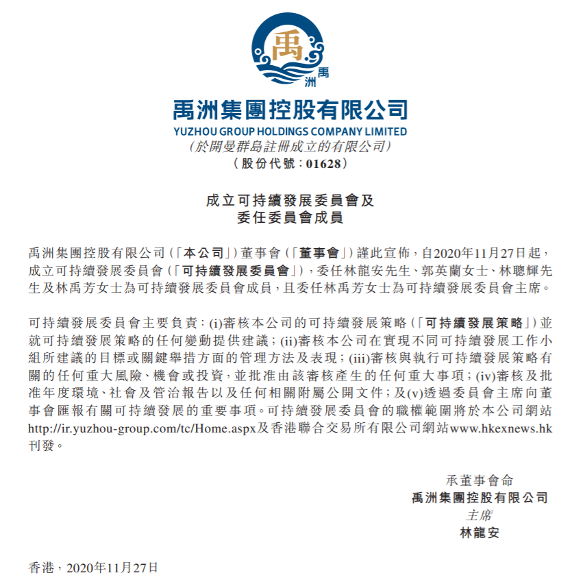 在堅持做好產(chǎn)品不忘本業(yè)的同時,禹洲亦時刻謹記肩負社會責任,著重可持續(xù)發(fā)展,踐行與環(huán)境和諧共融共生,致力提高環(huán)境、社會及企業(yè)管治水平。11月27日,禹洲集團董事會成立可持續(xù)發(fā)展委員會,并委任董事局主席林龍安先生、董事局副主席郭英蘭女士、執(zhí)行董事林聰輝先生及執(zhí)行董事林禹芳女士為可持續(xù)發(fā)展委員會成員,且委任林禹芳女士為可持續(xù)發(fā)展委員主席,管治架構全新升級,繼續(xù)引領集團可持續(xù)發(fā)展。