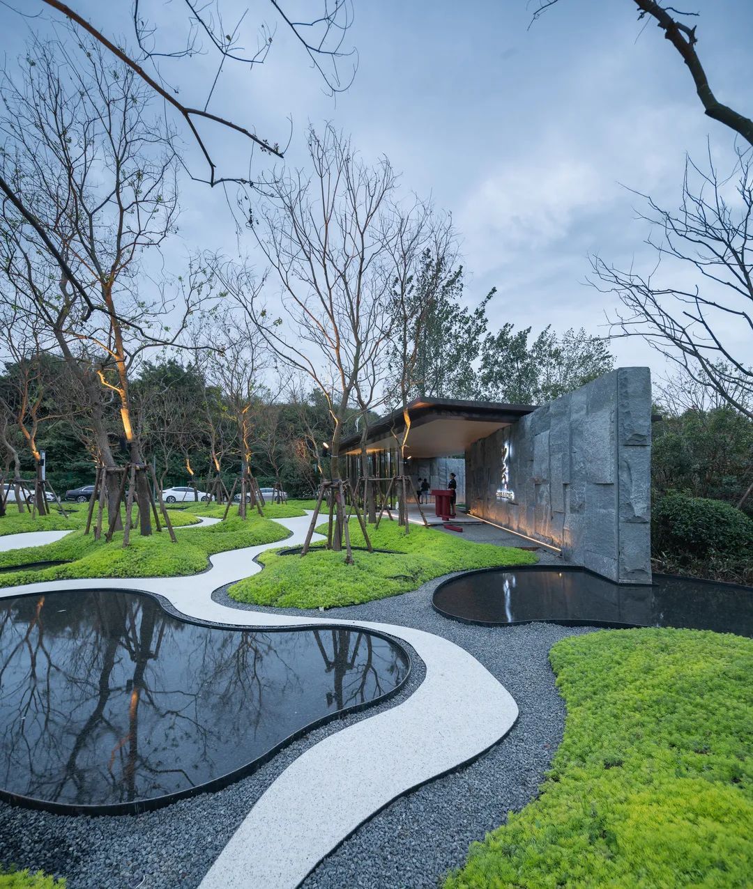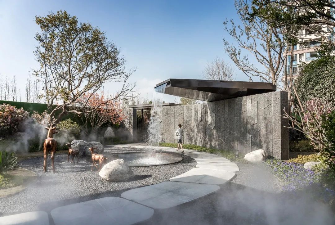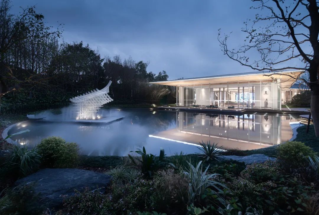 入口門(mén)扉藏于林后,門(mén)前是一片有水有林的自然野生林地。水上花園,以不規(guī)則的圓弧水景和坡地、園路,打造了現(xiàn)代版的世外桃源,雕塑藏于植物之中。背景的鏡面不銹鋼幕布將門(mén)前的林帶重重反射,將有限的場(chǎng)地放大處理,消隱了場(chǎng)地的邊界,邊界處放置霧噴,仙氣飄渺。