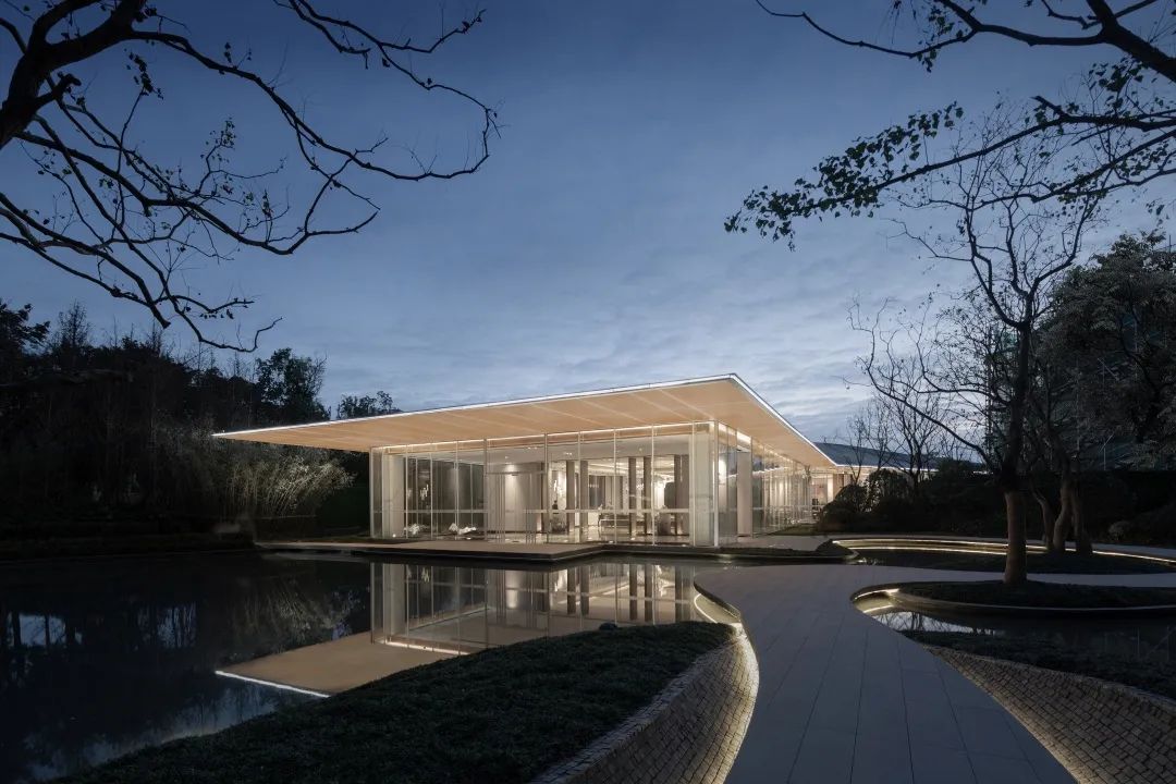 展示中心前,水蘊(yùn)入境。整個(gè)建筑在水景中倒影、浮現(xiàn),立面玻璃通透,干凈純粹。場(chǎng)地內(nèi)建筑、亭、橋、步道鄧互為對(duì)景,互相因借。山水交融,與蘇州古城的園林意境很好地融合。