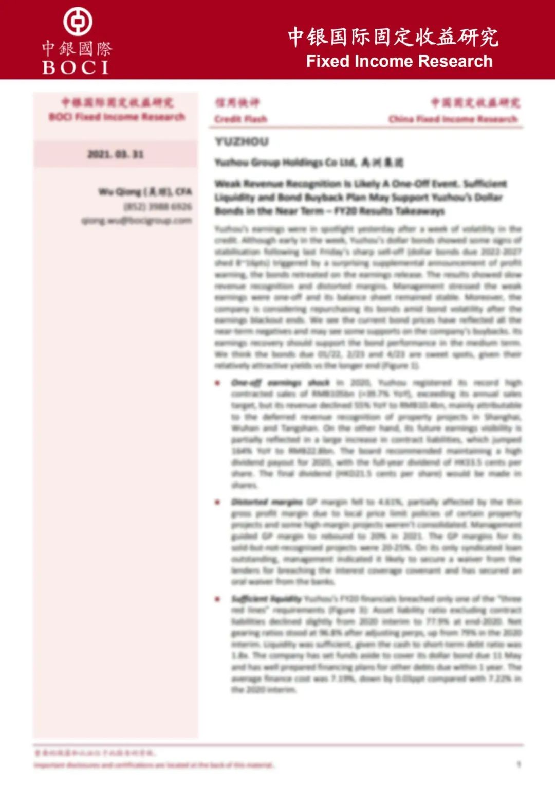 國際知名投行中銀國際近日發(fā)表固定收益類研究報告,禹洲集團(01628.HK)美元債表現(xiàn)已經逐漸表現(xiàn)出一定程度的企穩(wěn)跡象。報告指出,禹洲集團2020年的盈利下降屬一次性的,主要原因在于部分項目延遲交付導致收入延遲確認,以及高利潤項目未并表導致毛利率下降,而禹洲的資產負債表仍十分穩(wěn)健。中銀國際認為,目前禹洲的債券價格已充分反映了近期所有的負面因素,并且公司近期的債券回購展現(xiàn)了公司的充分信心,市場信心得以提振,預計集團在中期盈利的恢復將繼續(xù)支持債券的表現(xiàn)。