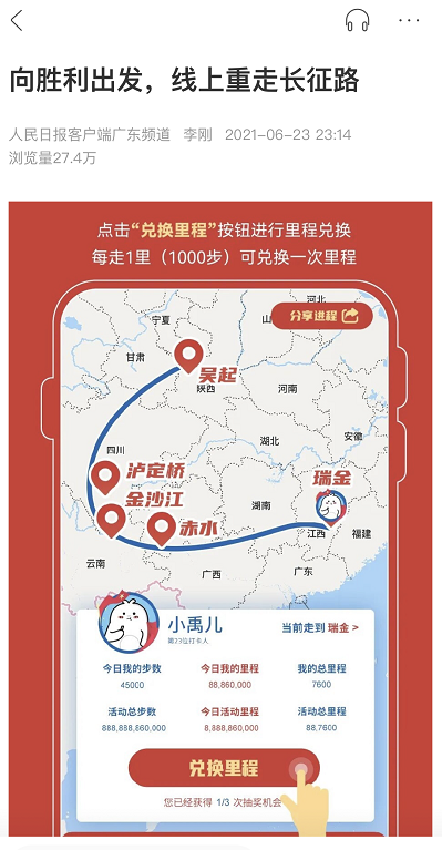 6月23日,《人民日報(bào)》發(fā)文稱:“本次活動(dòng)采用線上‘重走長征路’的方式,重溫紅色革命史,教育引導(dǎo)廣大黨員干部群眾學(xué)黨史、知黨恩、跟黨走。并通過這種形式的黨史學(xué)習(xí)教育,緬懷革命先烈的奮斗精神,傳承共產(chǎn)黨人的紅色基因,追尋初心,堅(jiān)守恒心,激發(fā)信心,從黨的奮斗歷程和歷史經(jīng)驗(yàn)中汲取養(yǎng)分和智慧,擴(kuò)大黨組織的影響力?!?/p>