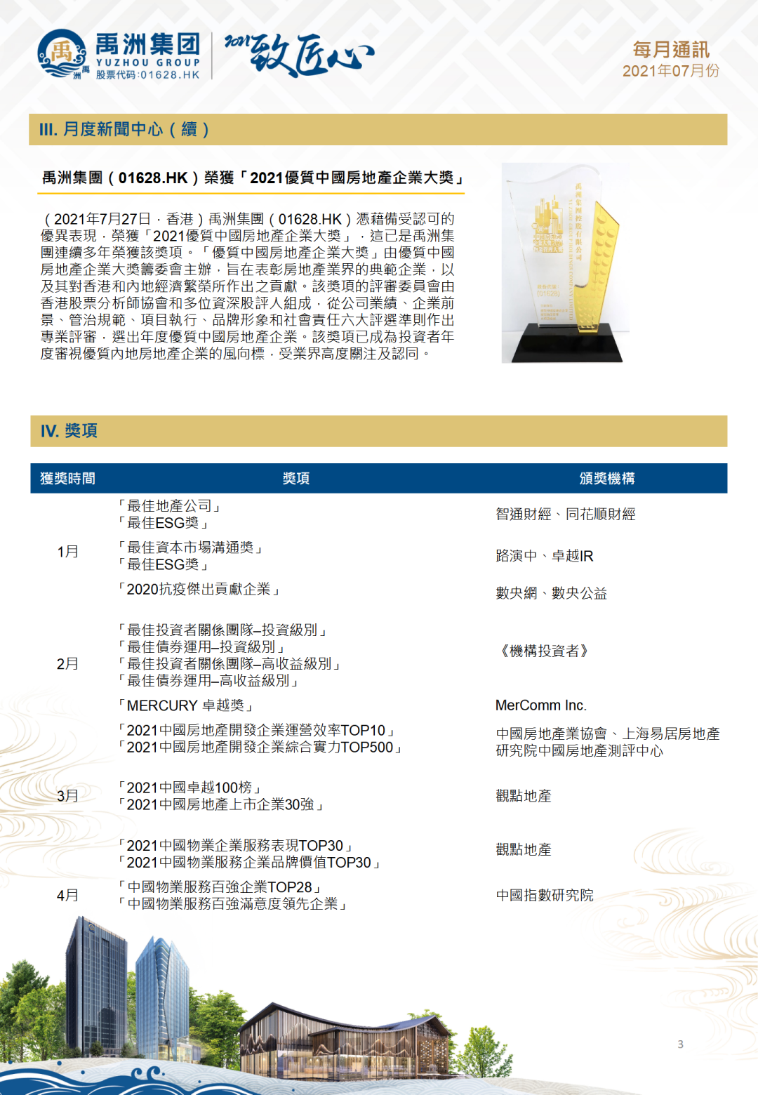 憑借備受認(rèn)可的優(yōu)異表現(xiàn),7月27日,禹洲集團(tuán)再次榮獲“2021優(yōu)質(zhì)中國房地產(chǎn)企業(yè)大獎”,這已是禹洲集團(tuán)連續(xù)多年榮獲該獎項(xiàng)?!皟?yōu)質(zhì)中國房地產(chǎn)企業(yè)大獎”由優(yōu)質(zhì)中國房地產(chǎn)企業(yè)大獎籌委會主辦,旨在表彰房地產(chǎn)業(yè)界的典范企業(yè),以及其對香港和內(nèi)地經(jīng)濟(jì)繁榮所作出之貢獻(xiàn)。該獎項(xiàng)已成為投資者年度審視優(yōu)質(zhì)內(nèi)地房地產(chǎn)企業(yè)的風(fēng)向標(biāo),受業(yè)界高度關(guān)注及認(rèn)同。