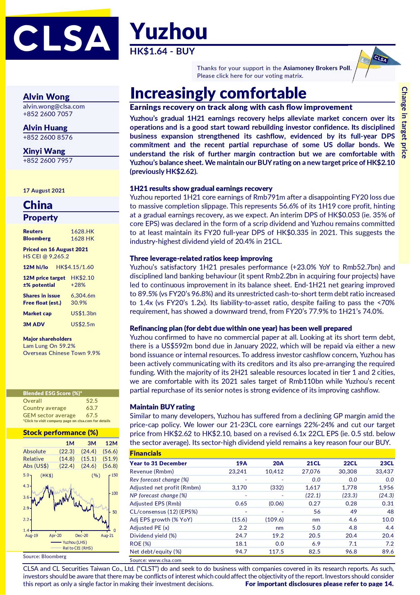國際知名投行中信里昂近日發(fā)表研報(bào)指出,禹洲集團(tuán)(01628.HK)2021年上半年核心盈利達(dá)人民幣11.4億元,其逐漸恢復(fù)的盈利水平有助建立投資者良好信心。此外,禹洲穩(wěn)健的業(yè)績增長保證了充裕的現(xiàn)金流,從其豐厚的全年股息收益及近期美元債券的積極回購動(dòng)作足以反映這點(diǎn)。中信里昂認(rèn)為禹洲集團(tuán)資產(chǎn)負(fù)債表十分健康,重申“買入”評級。
