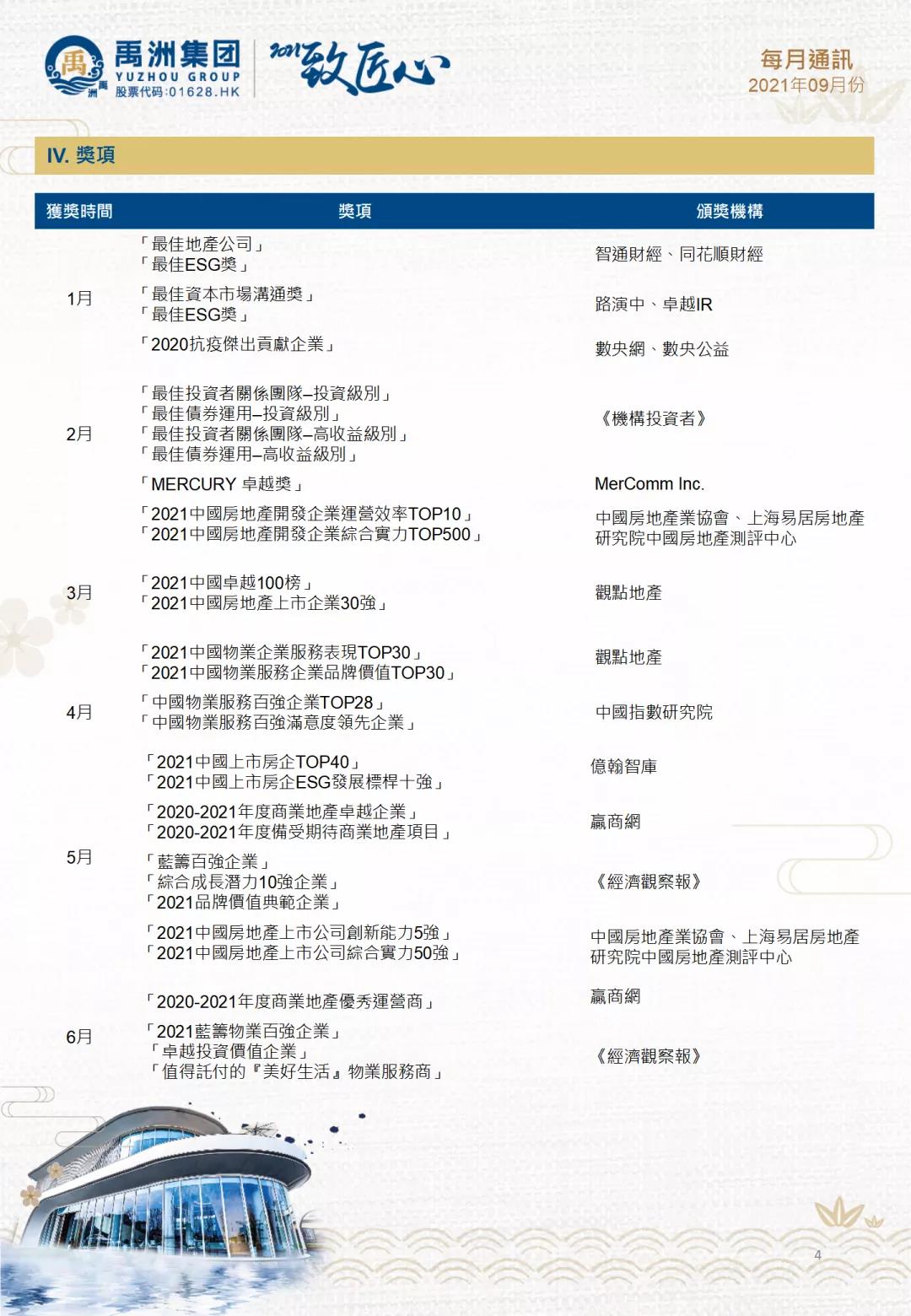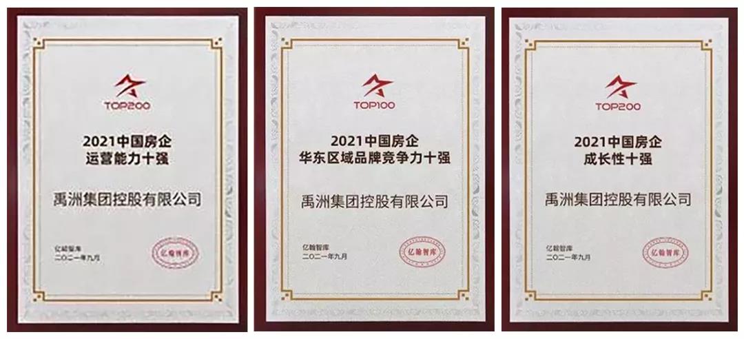禹洲集團更于9月15日在“2021中國房地產(chǎn)品牌價值研究成果發(fā)布會暨第十八屆中國房地產(chǎn)品牌發(fā)展高峰論壇”上獲得 “2021中國物業(yè)服務標準化運營領(lǐng)先品牌企業(yè)”、 “2021值得資本市場關(guān)注的物業(yè)品牌”兩項大獎;于9月16日在“2021博鰲房地產(chǎn)論壇”中榮獲“2021年度影響力地產(chǎn)企業(yè)(30強)”、“2021年度社會責任房地產(chǎn)企業(yè)”,再次力證集團領(lǐng)先的綜合實力和競爭力。