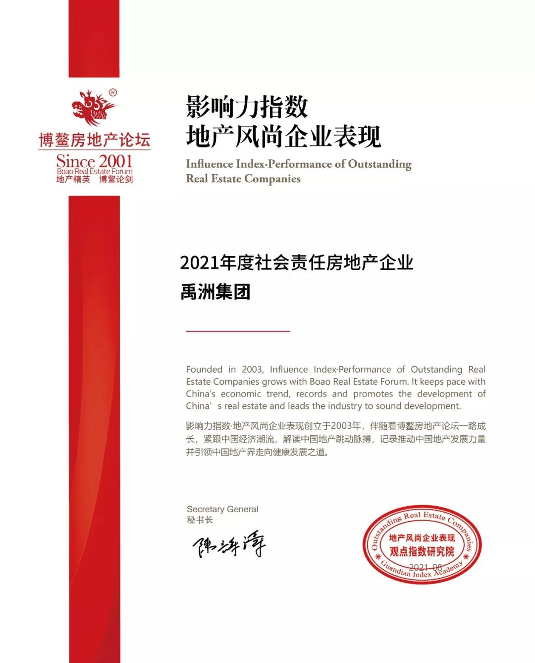 日前,禹洲集團(tuán)憑借在履行社會責(zé)任領(lǐng)域的突出貢獻(xiàn),獲得由觀點(diǎn)地產(chǎn)機(jī)構(gòu)頒發(fā)的“2021年度社會責(zé)任房地產(chǎn)企業(yè)”的榮譽(yù)稱號。