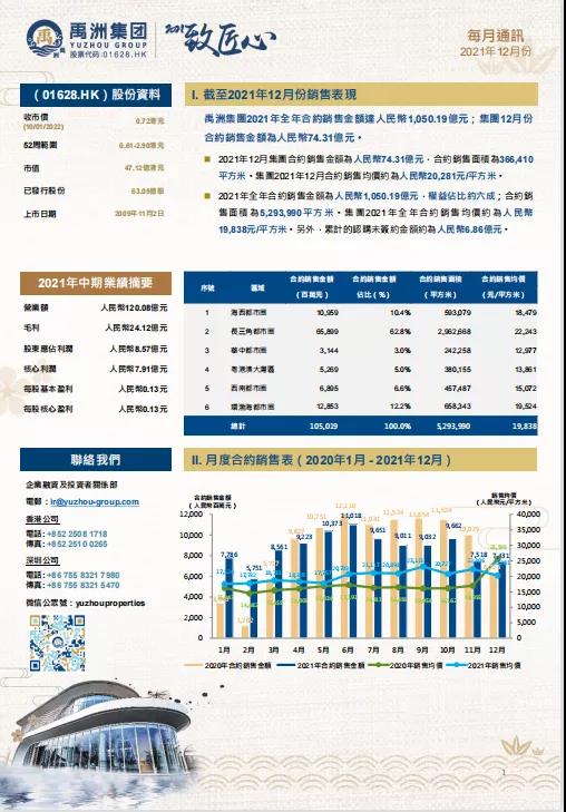 2021年12月,禹洲集團實現(xiàn)合約銷售金額為人民幣74.31億元,合約銷售面積為366,410平方米,合約銷售均價約為人民幣20,281元/平方米。