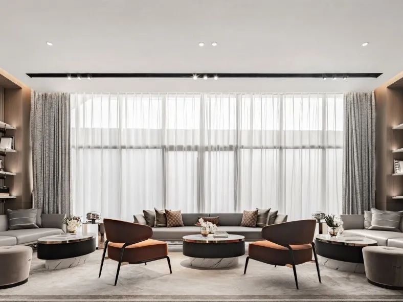 沙發(fā)與挑空的大廳之間構(gòu)筑出了通透的空間視野,色調(diào)柔順、舒適、自然。延續(xù)著云與水的韻味和優(yōu)雅精致的調(diào)性,也彰顯著和諧大氣、簡(jiǎn)約形意的空間氣質(zhì)。