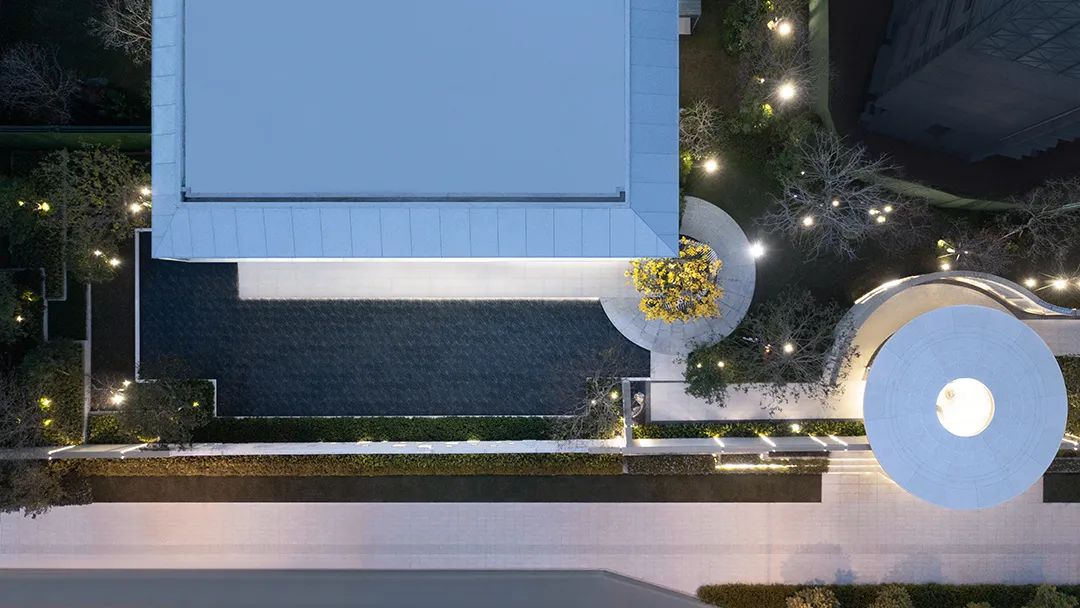 鏡面水景映襯著建筑與景墻,彼岸則仿佛漂浮于水面之上;每當(dāng)夜幕降臨,月懸浮于境面之上,仿佛伸手觸碰就能攬入懷中。而遠(yuǎn)處層疊錯(cuò)落的特色種植池像島又像山,影影綽綽地籠罩著一層輕紗,幽秘而靈動(dòng)。