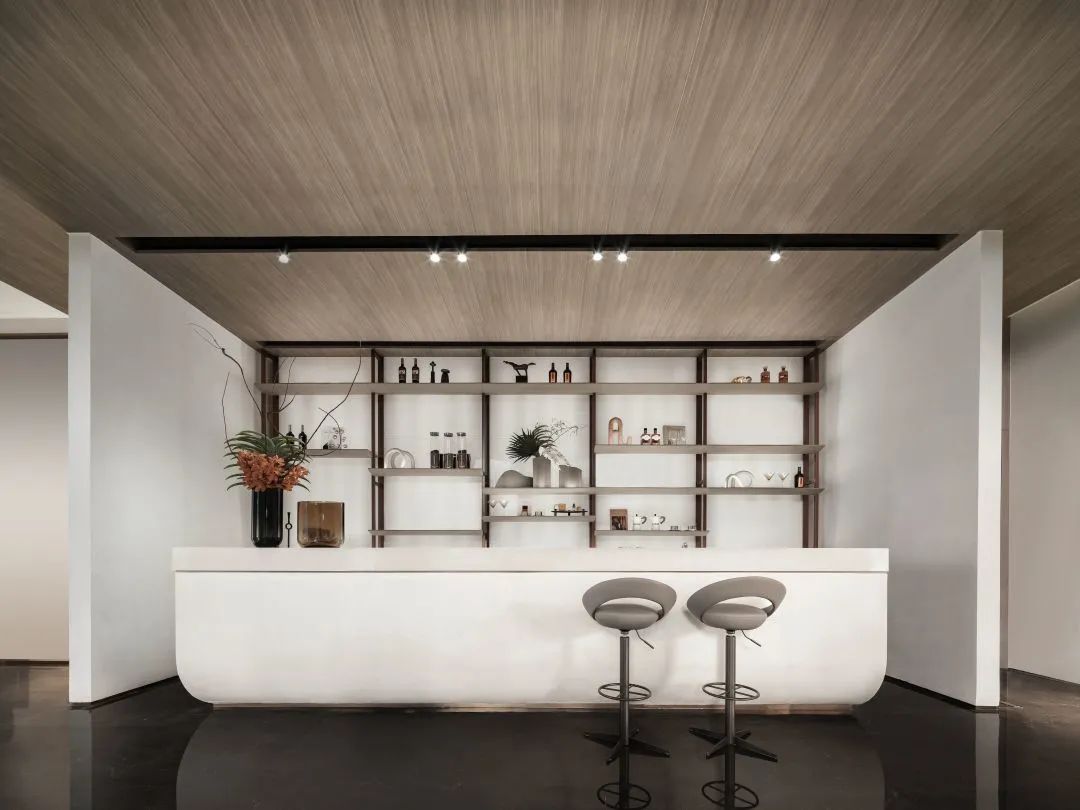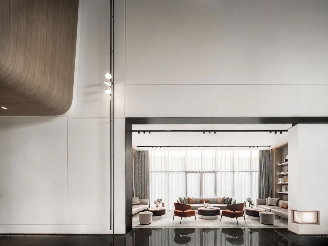 純白是水的意象,簡(jiǎn)約纖長(zhǎng)的黑色金屬線條以半合圍的結(jié)構(gòu)框出深度洽談區(qū)的藝術(shù)空間。隱匿于墻體的燈箱有效地消解著空間秩序所帶來(lái)的硬朗感,讓空間的入口變得更加開(kāi)放、柔和,而淡雅的色彩滿足一切生發(fā)于心的視覺(jué)享受。