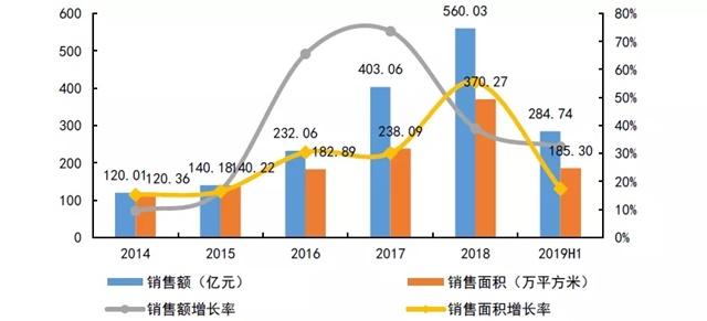圖:2014-2019年上半年禹洲銷售額和銷售面積增長情況
