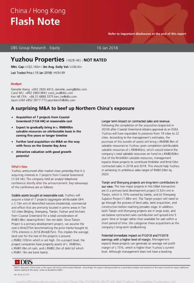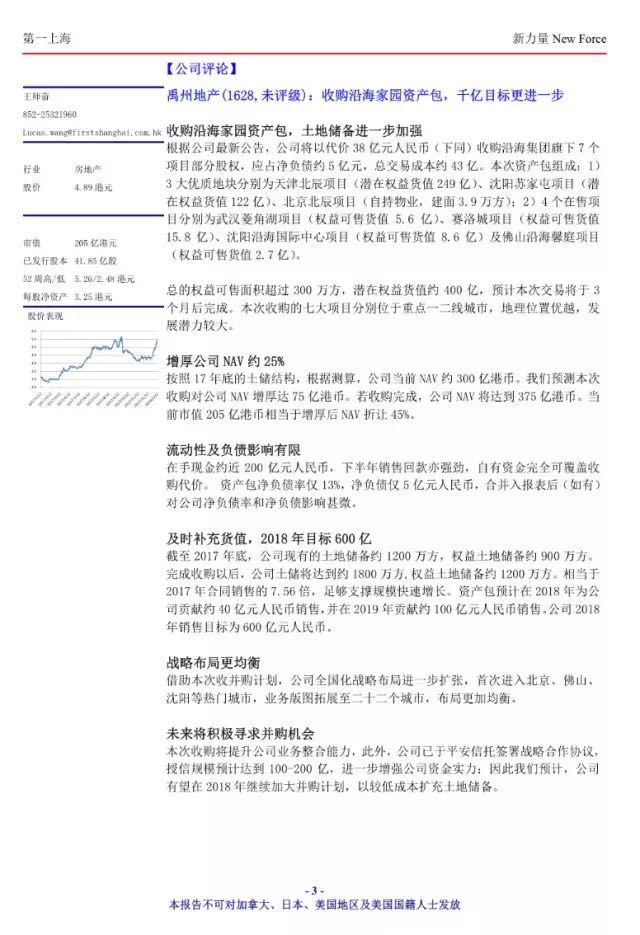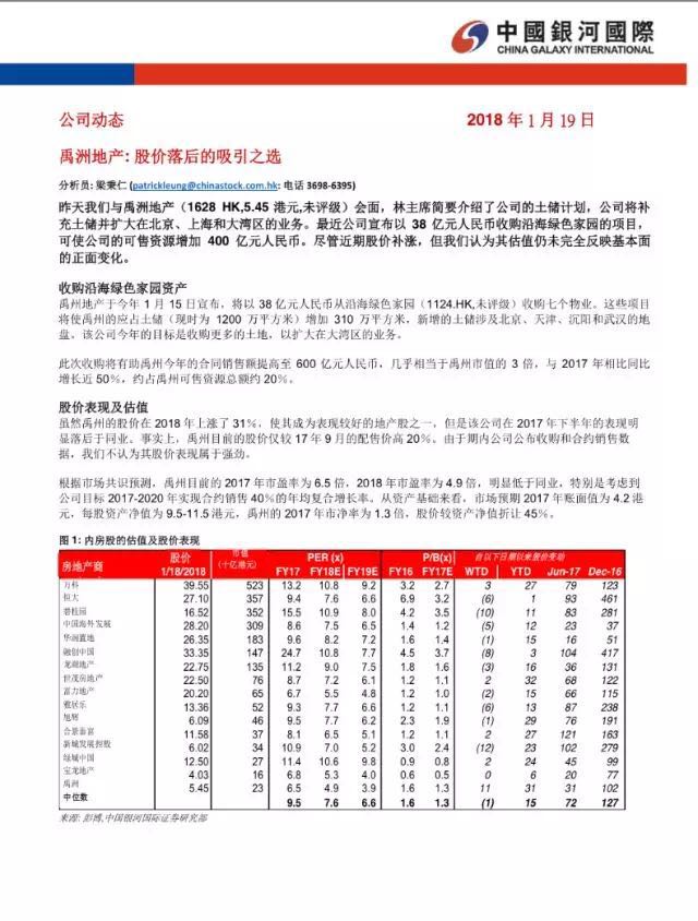 銀河國(guó)際認(rèn)為,此次收購(gòu)將有助禹洲今年的合同銷售額提高至人民幣600億元,幾乎相當(dāng)于禹洲市值的3倍,與2017年相比同比增長(zhǎng)近50%,約占禹洲可售資源總額約20%。盡管近期股價(jià)補(bǔ)漲,但該行認(rèn)為其估值仍未完全反映基本面的正面變化。