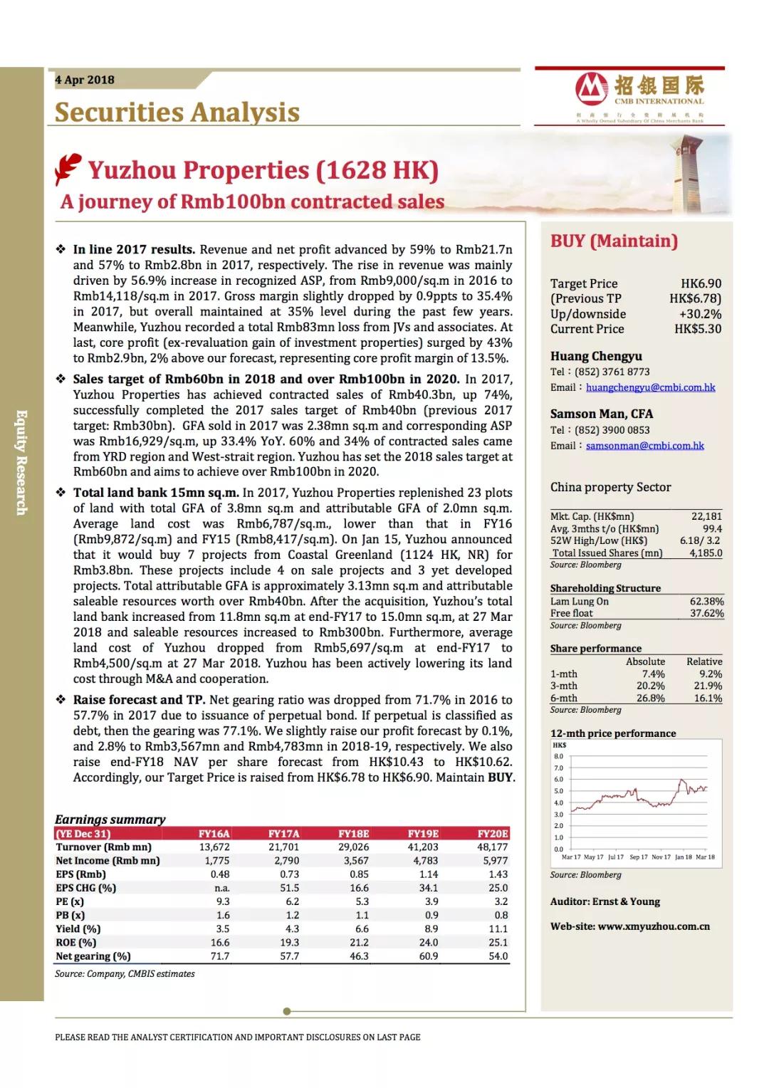 由于公司2017年發(fā)行了一筆3億美元的永續(xù)證券,凈負(fù)債率從2016年的71.7%下降至2017年的57.7%。如果計(jì)入永續(xù)證券,則凈負(fù)債率為77.1%。招銀國(guó)際分別上調(diào)禹洲地產(chǎn)2018年和2019年的預(yù)期收入增長(zhǎng)比例0.1%/2.8%至2018年的人民幣36億元和2019年的人民幣48億元。同時(shí),招銀國(guó)際上調(diào)了禹洲地產(chǎn)未來(lái)兩年的每股凈資產(chǎn)值至10.43港元和10.62港元。因此,該行將禹洲地產(chǎn)的目標(biāo)價(jià)上調(diào)至6.9港元,重申“買(mǎi)入”評(píng)級(jí)。