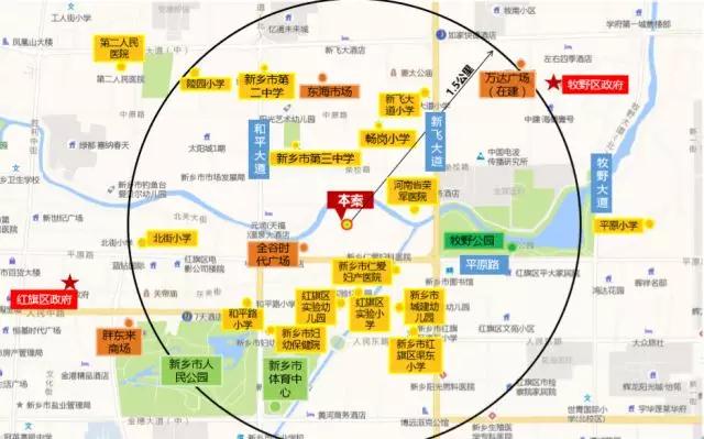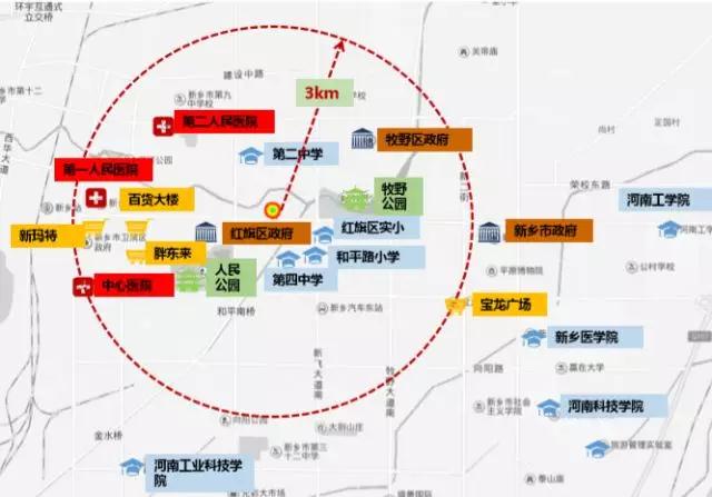 教育資源有紅旗區(qū)實驗小學、和平路小學、第四中學、第二中學;商業(yè)資源有胖東來、百貨大樓、新瑪特;醫(yī)療資源有第一人民醫(yī)院、第二人民醫(yī)院、中心醫(yī)院;景觀有人民公園與牧野公園。