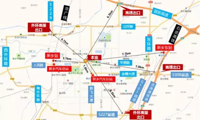 項目處于市區(qū)中心,距離新鄉(xiāng)站及兩個汽車站均在3公里范圍內(nèi),東西兩側(cè)都有高鐵線,與其他城市關聯(lián)度強,距離最近的高速口為6.3公里,因地處新鄉(xiāng)市中心,通達性較好。