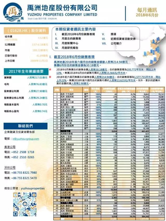 2018年6月集團合約銷售金額人民幣30.18億元;合約銷售面積為193,772平方米,同比上升13% 。集團2018年6月合約銷售均價約人民幣15,566元/平方米。