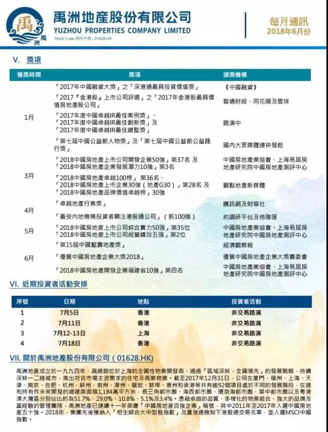 6月5日,“第十五屆(2018)中國藍籌地產(chǎn)年會”于北京召開,集團憑借優(yōu)良的業(yè)績、穩(wěn)定的收益、股價走勢穩(wěn)健、市場形象良好等表現(xiàn),榮登中國藍籌企業(yè)榜主榜,并獲得“中國藍籌地產(chǎn)獎”。6月12日,禹洲地產(chǎn)榮獲由優(yōu)質(zhì)中國房地產(chǎn)企業(yè)大獎籌委會頒發(fā)的“優(yōu)質(zhì)中國房地產(chǎn)企業(yè)大獎2018”。禹洲地產(chǎn)此次斬獲兩項大獎,充分表明房地產(chǎn)市場和資本市場對禹洲集團的高度肯定,以及對其投資價值的認可。
