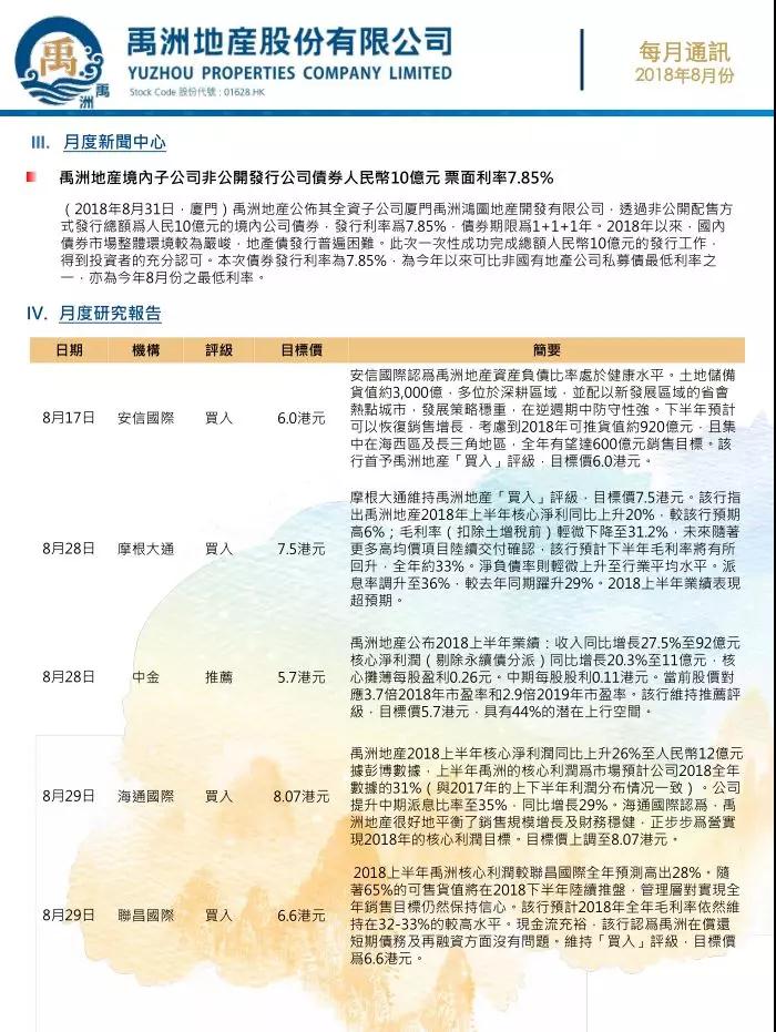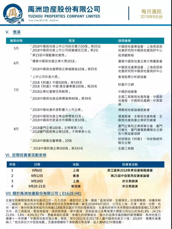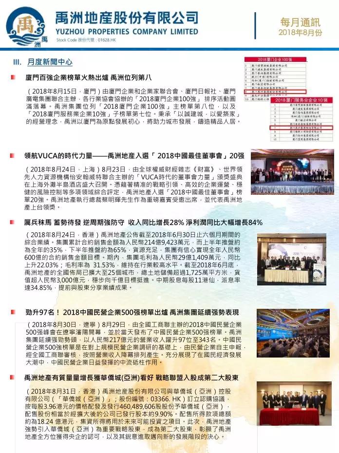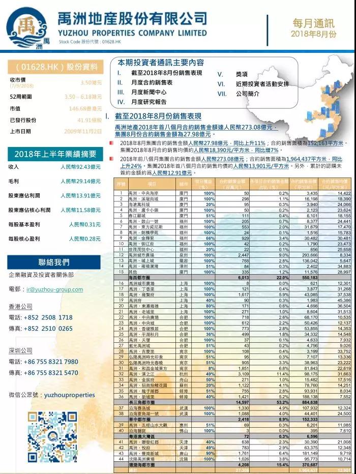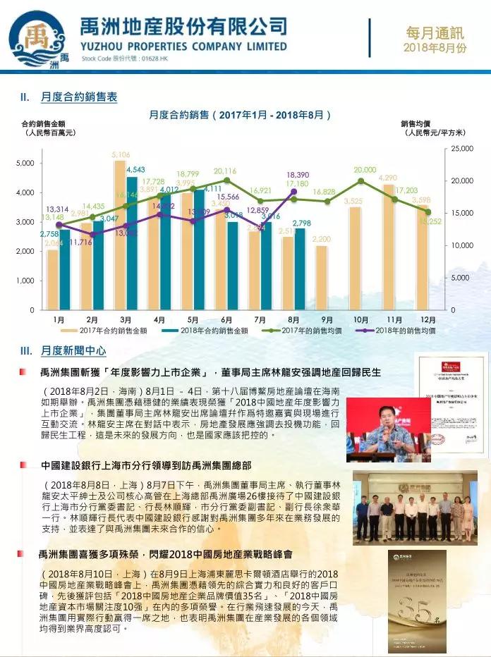 2018年8月集團合約銷售金額人民幣27.98億元,同比上升11%;合約銷售面積為152,163平方米。集團2018年8月合約銷售均價約人民幣18,390元/平方米,同比增7%。