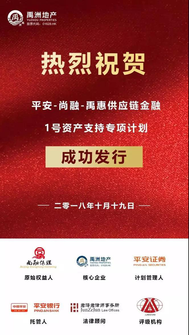 10月19日,禹洲地產(chǎn)股份有限公司成功發(fā)行“平安-尚融-禹惠供應(yīng)鏈金融1號資產(chǎn)支持專項計劃”,發(fā)行規(guī)模達人民幣5.91億元,期限為1年,發(fā)行利率7.9%。該項目是禹洲地產(chǎn)發(fā)行的首筆供應(yīng)鏈ABS,取得開門紅。