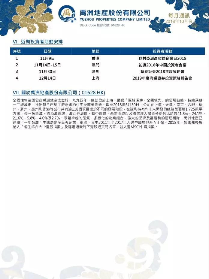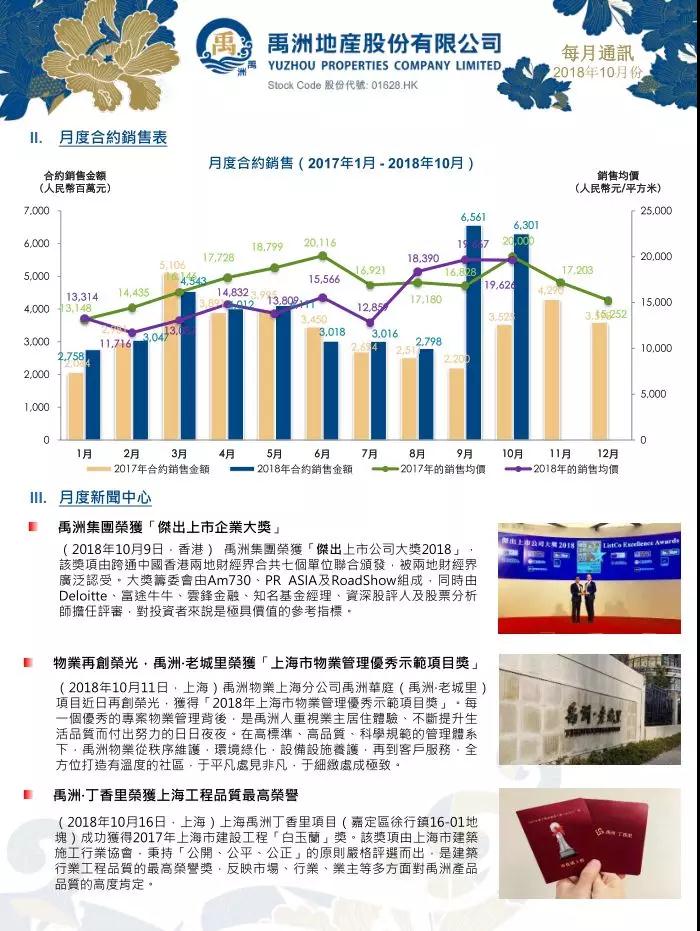 2018年10月集團合約銷售金額人民幣63.01億元,同比勁升79%;合約銷售面積為321,045平方米,同比上升82%。集團2018年10月合約銷售均價約人民幣19,626元/平方米。