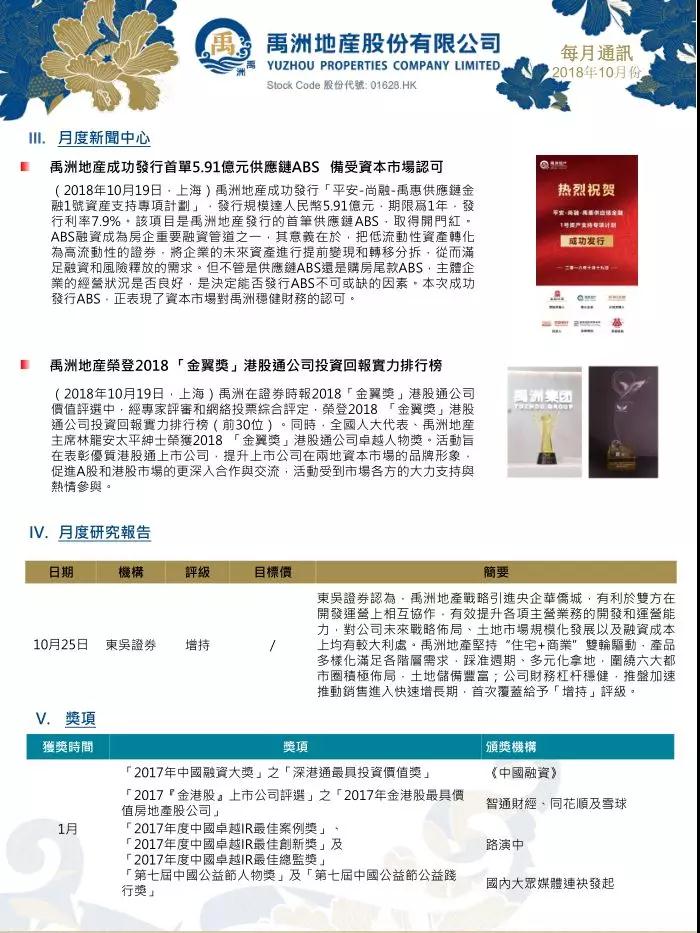 10月9日,禹洲集團榮獲“杰出上市公司大獎2018”。該獎項由跨通中國香港兩地財經(jīng)界合共七個單位聯(lián)合頒發(fā),被兩地財經(jīng)界廣泛認受。大獎籌委會由Am730、PR ASIA及RoadShow組成,同時由Deloitte、富途牛牛、云鋒金融、知名基金經(jīng)理、資深股評人及股票分析師擔任評審,對投資者來說是極具價值的參考指標。