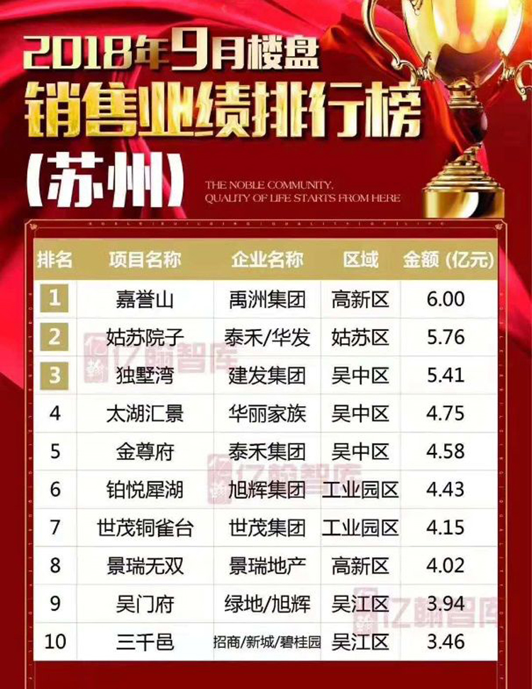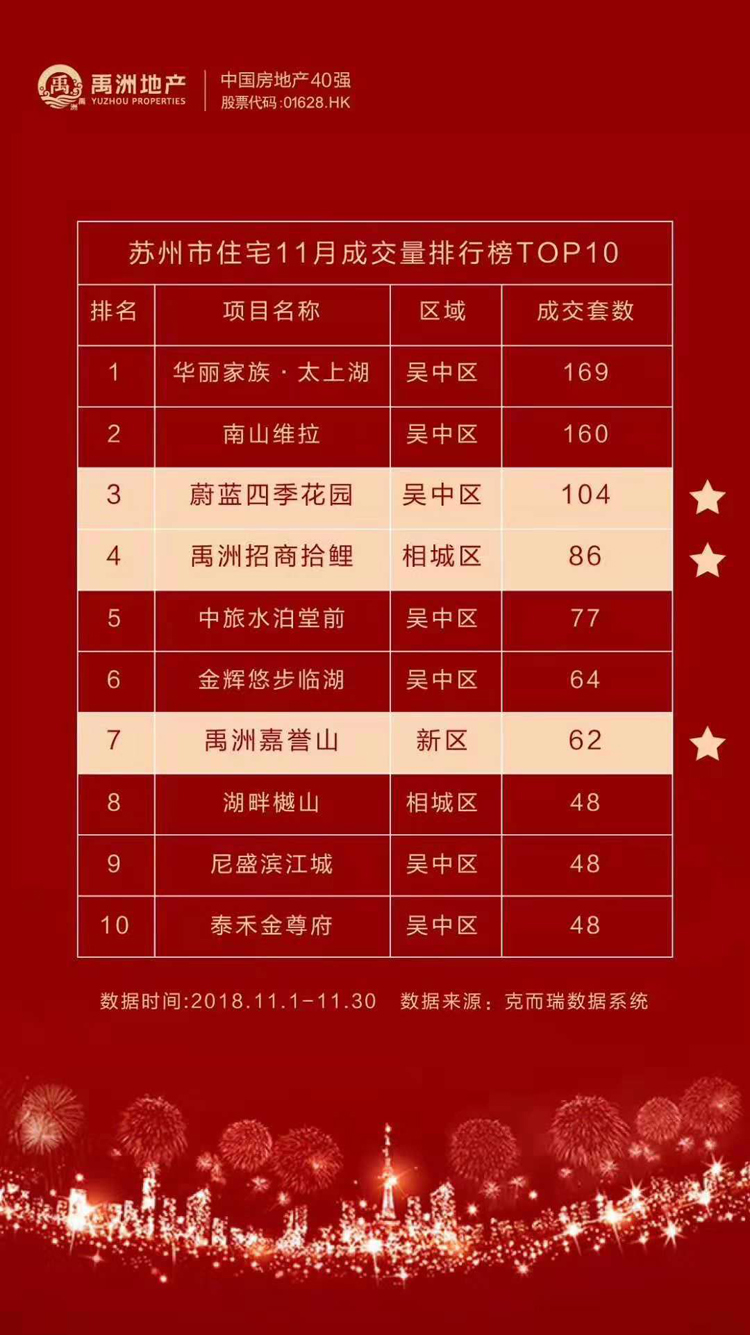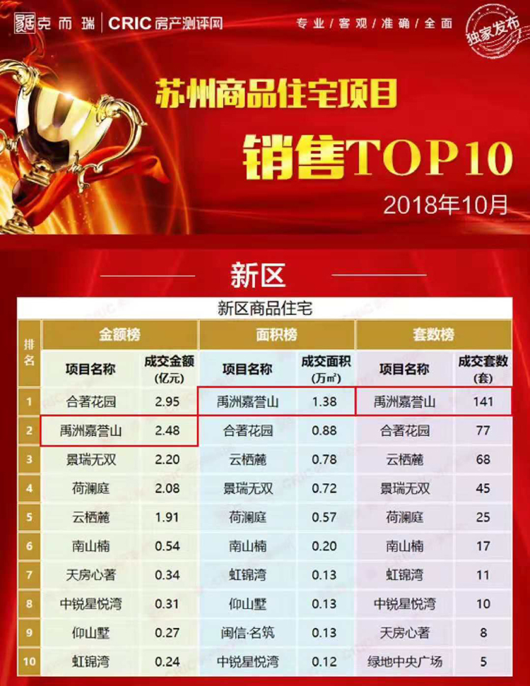 早在“金九銀十”時期,禹洲就已頻頻發(fā)力,以禹洲嘉譽山、禹洲招商拾鯉、蔚藍四季花園為主的多個樓盤接連開盤加推,屢屢熱銷,持續(xù)數月占據蘇州新房銷售榜單前列。