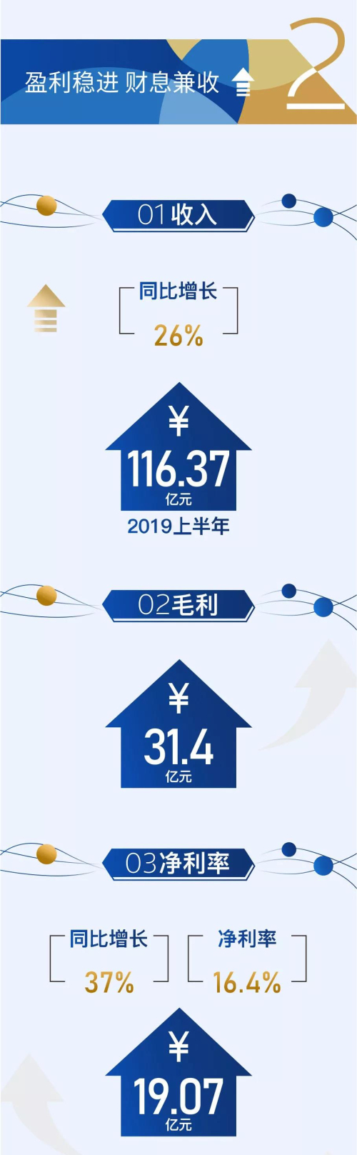 2019上半年,公司毛利為31億4,042萬(wàn)元,母公司擁有人應(yīng)占利潤(rùn)同比上升23.22% 至16億3,912萬(wàn)元;母公司擁有人應(yīng)占核心利潤(rùn)同比上升20.63% 至13億9,700萬(wàn)元。每股核心利潤(rùn)為27.98分,同比上升5.82%。每股基本盈利為33.02分,同比上漲8.09%。同時(shí),現(xiàn)金及銀行結(jié)余為389.2619億元,同期上升32.95%。