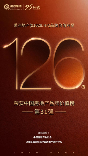 喜報!品牌價值126億元 禹洲榮獲中房協(xié)品牌價值第31強