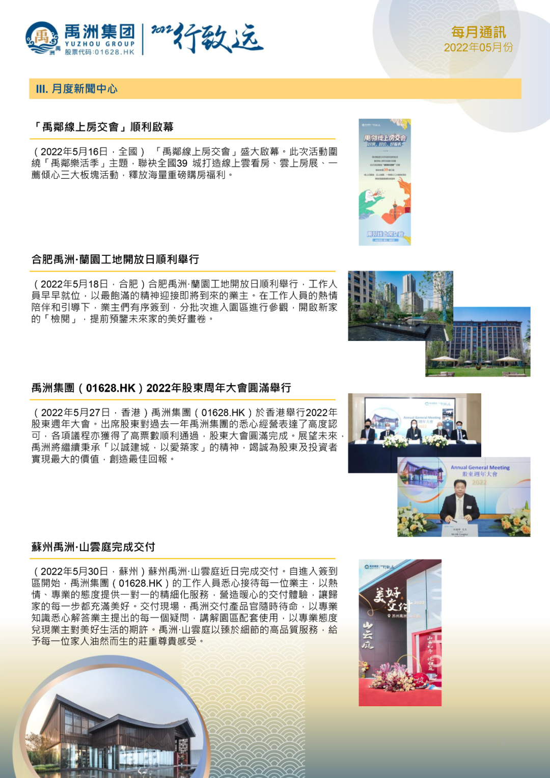 展望未來,禹洲集團(tuán)將繼續(xù)堅(jiān)持“艱苦奮斗、家國(guó)情懷、風(fēng)清氣正”的禹洲文化,遵從“保交房、保民生、保償付、保穩(wěn)定”的四保要求,積極履行承諾,不辜負(fù)投資人對(duì)公司的信任。繼續(xù)秉承“以誠(chéng)建城,以愛筑家”的精神,竭誠(chéng)為股東及投資者實(shí)現(xiàn)最大的價(jià)值,創(chuàng)造最佳回報(bào)。