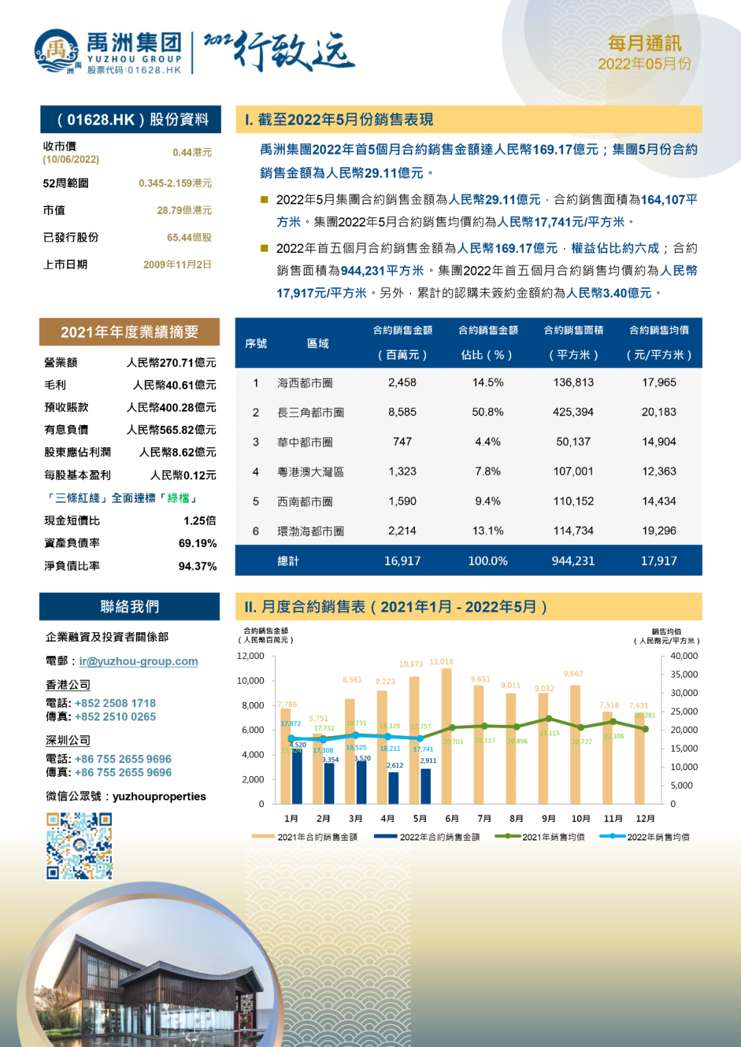 2022年5月,禹洲集團(tuán)實(shí)現(xiàn)合約銷售金額為人民幣29.11億元,合約銷售面積為164,107平方米,合約銷售均價(jià)約為人民幣17,741元/平方米。