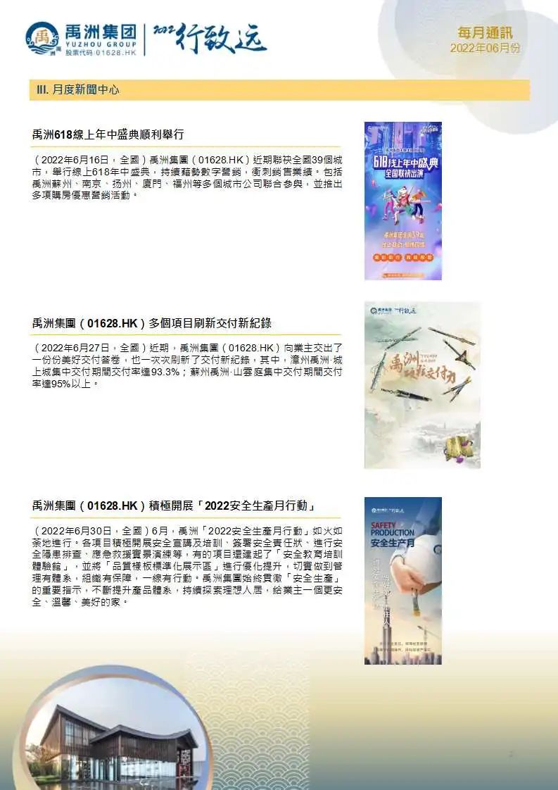 2022年6月,禹洲集團(tuán)實現(xiàn)合約銷售金額為人民幣40.31億元,合約銷售面積為200,946平方米,合約銷售均價約為人民幣20,062元/平方米。