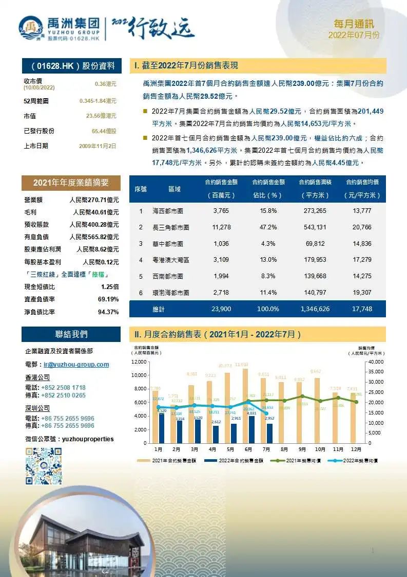 2022年前7個月,禹洲集團實現(xiàn)累計銷售金額為人民幣239.00億元,累計銷售面積為1,346,626平方米,平均銷售價格為人民幣17,748元/平方米。另外,截至2022年7月31日,集團累計的認(rèn)購未簽約金額為人民幣4.45億元。