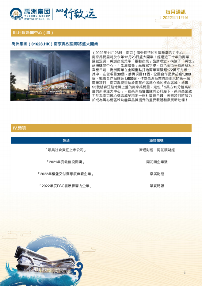 2022年前11個月,禹洲集團(tuán)實現(xiàn)累計銷售金額為人民幣338.03億元;累計銷售面積為1,914,551平方米;平均銷售價格為每平方米人民幣17,657元。另外,截至2022年11月30日,集團(tuán)累計的認(rèn)購未簽約金額約為人民幣4.11億元。